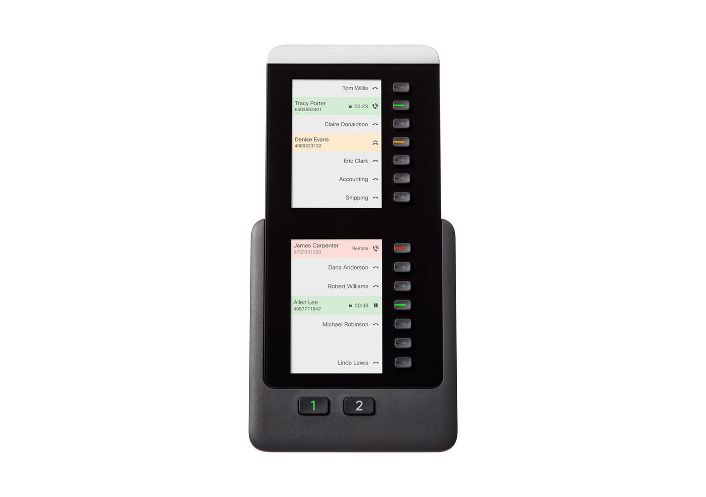 Moduł Cisco CP-8800-A-KEM= zapewnia 28 dodatkowych, programowalnych przycisków, które można wykorzystać do szybkiego wybierania, monitorowania linii (BLF) lub dostępu do funkcji.